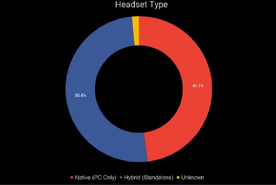 SteamVR 作为一个典型的 PCVR 平台,里面仅统计基于有线/无线串流平台的设备数据,从数据中可以看到,VR 一体机的数量目前已经高于 50%,超越了原生 PCVR 用户群体。