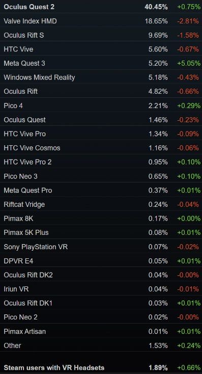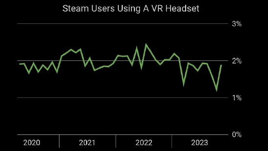 Quest 2 的使用率也略有增加,拥有 VR 头显的 Steam 用户总百分比也有所增加。这表明 PC 游戏玩家正在购买最近打折的 Quest 2,而且许多 Quest 3 购买者是 VR 新手,而不仅仅是从以前的头显升级。
