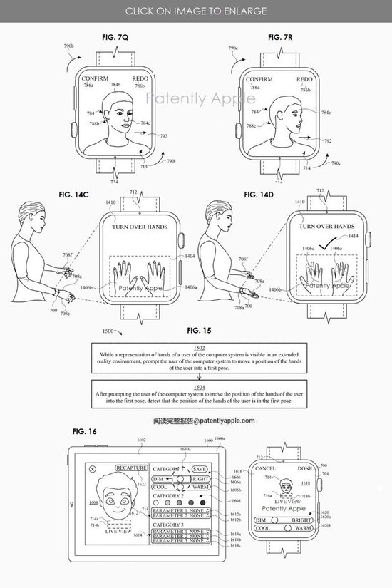 苹果专利图 7Q 和 7R 是注册过程的更直观效果,如 Face ID;在图 14C&D 中,我们看到用户被要求注册用户手部的图像,以便在需要时可以将它们与化身一起使用;图 15 是提示用户以多个姿势放置用户手部的方法流程图。