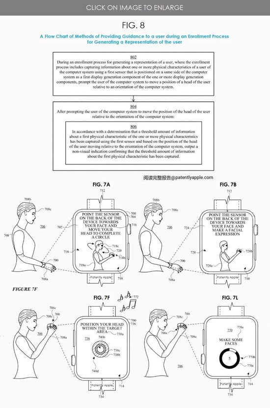 苹果专利图 8 是在生成用户虚拟化身的过程中向用户提供指导的方法流程图;图 7A、B、F 和 L 说明了用于在 Apple Watch 上生成用户虚拟化身和/或显示用户虚拟化身的注册过程的示例技术。